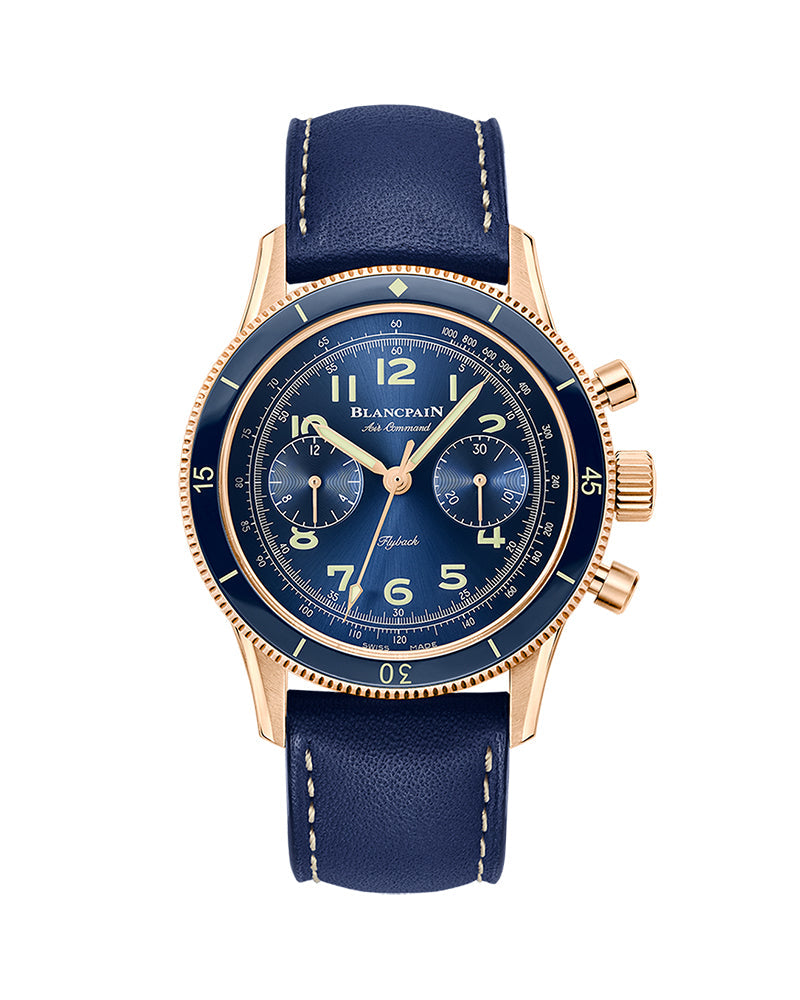 Caliber F388B Automatic, Secure Movement,The flyback chronograph, which measures a succession of elapsed times, eliminates many superfluous repetitive operations.Tachometer Two-way rotating 18ct red gold bezel with blue ceramic insert and Super-LumiNova® hour-markers.Dial Color - Blue,Case Material - Red Gold, Water Resistance - 3 bar, Case Diameter - 42.5 mm, Case Thickness - 13.7 mm, Sapphire Back - Yes, Width Between Horns - 22 mm.Strap Type - Leather strap, Strap Clasp -Folding clasp