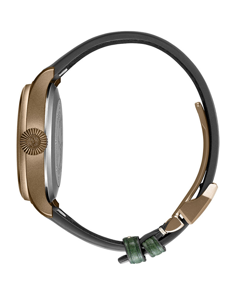 BIG PILOTÕS WATCH 43 SPITFIRE- The Big PilotÕs Watch 43 Spitfire features a military aesthetic with a bronze case and crown, as well as a military green dial and gold-plated hands.Throughout its history, IWC Schaffhausen has engineered numerous mil-spec watches for different branches of the British military. These service watches were characterized by high-precision movements, extreme ruggedness, a functional design with easily legible dials, and purpose-built technical features. The Spitfire PilotÕs Watches reflect this chapter of the brandÕs history. The Big PilotÕs Watch 43 Spitfire features the typical Big PilotÕs design with the striking conical crown in an ergonomic 43-millimetre case, combined with a distinct military aesthetic. The case and crown are made of bronze, while the case back is made of titanium. Alongside copper, the bronze used by IWC also contains aluminum and iron. This specific composition makes the alloy about 50 per cent harder than standard bronze. Bronze develops a unique patina over time, giving each timepiece a distinctive character and look of its own. The warm colour of the bronze harmonizes with the military green dial and the gold-plated hands. To facilitate readability at night, the hands and hour markers have been coated with luminescent material. Fitted with a green leather strap with a unique texture, the timepiece also features IWCÕs new EasX-CHANGE system, allowing the wearer to change the strap quickly and easily at the touch of a button. At work inside the case is the IWC-manufactured 82100 calibre movement. The Pellaton winding system, reinforced with ceramic components, builds up a power reserve of 60 hours. A soft-iron inner case protects the movement from the effects of magnetic fields.
