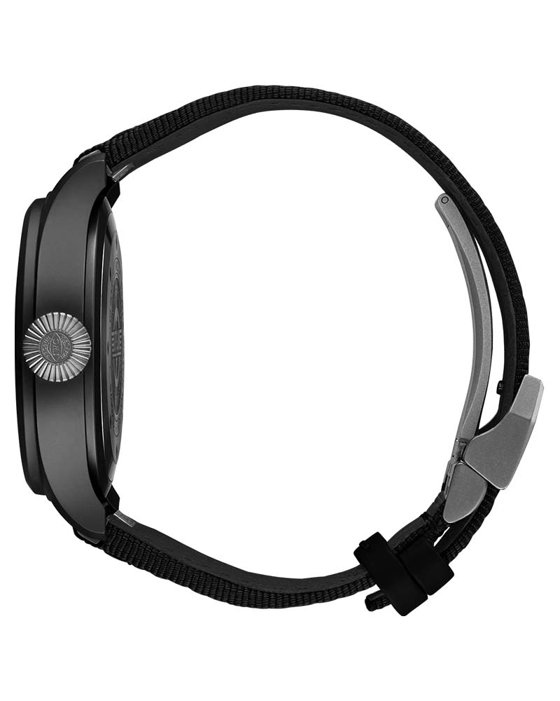 The Big Pilot’s Watch in black ceramic has been a staple of IWC's TOP GUN line since 2012. Now, this classic design is available in an ergonomic 43-millimetre case for the first time. The Big Pilot's Watch 43 TOP GUN features an extremely hard and scratch-resistant case made of black zirconium oxide ceramic, a black dial and black hands, as well as white printing and luminescence. The case back with the engraving of the TOP GUN logo and the crown are made of titanium. Ticking away inside is the IWC-manufactured 82100 calibre. The high-end automatic movement boasts a Pellaton winding system that has been reinforced with ceramic components and builds up a power reserve of 60 hours. The movement is protected from the effects of magnetic fields by a soft-iron inner case. This classic TOP GUN timepiece is fitted with a green textile strap. Thanks to the integrated EasX-CHANGE®, the strap can be easily exchanged at the touch of a button. Combined with the 10 bar water-resistant case, this makes the Big Pilot's Watch 43 TOP GUN a highly versatile sports watch