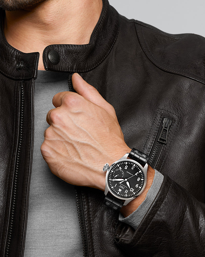 BIG PILOTÕS WATCH - In 2016, IWC took a step back towards the roots of the Big PilotÕs Watch and gave it a gentle facelift. The IWC-manufactured 52110-calibre movement unites some of watchmakingÕs greatest achievements. It features an efficient Pellaton automatic winding system with parts made from black or white ceramic. With the help of two barrels, it builds up a reserve of 7 days. The display at Ò3 o clockÓ indicates the time remaining until the movement comes to a stop. The Big PilotÕs Watch has a date display at Ò6 o clockÓ and the central seconds essential in any watch used for flying. The 46-millimetre case, which is water-resistant to 6 bar, encloses a soft-iron inner case that protects the movement against magnetic fields. The watch also features a striking conical crown. The legendary Junkers JU-52 plane is engraved on the case back of the Big PilotÕs Watch. This model comes with a black strap, which perfectly complements the watch.