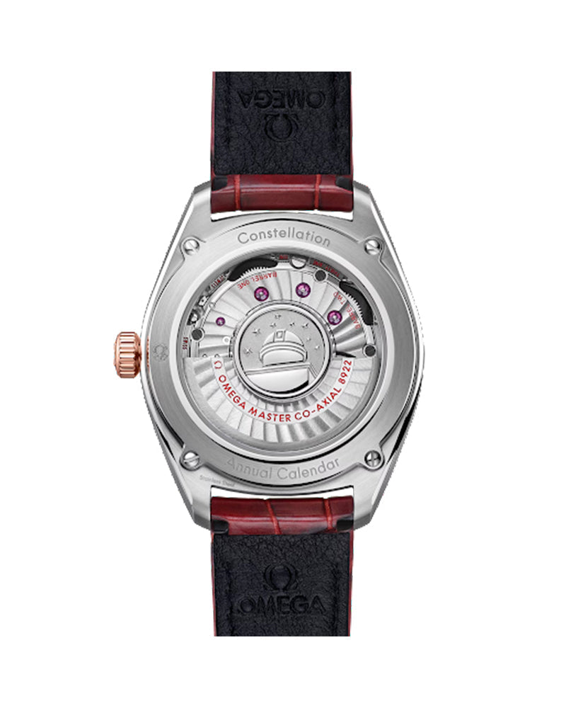 This watch has a burgundy leather strap and is driven by OMEGA's Co-Axial Master Chronometer Annual Calendar Calibre 8922, featuring revolutionary anti-magnetic technology.