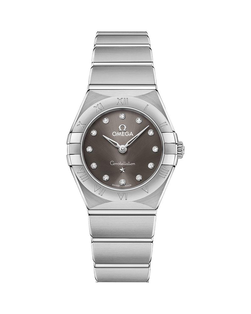 This 25 mm stainless steel model features a bezel engraved with Roman numerals, sun-brushed grey dial with diamond hour markers and scratch-resistant saphire crystal. The hands, OMEGA logo, Constellation star and diamond holders are in 18K white gold.