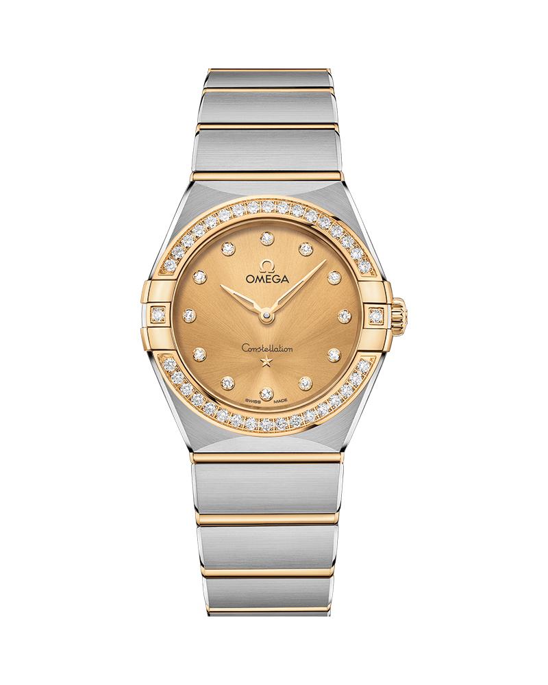 This 28 mm 18K yellow gold and stainless steel model features a diamond-paved bezel, sun-brushed champagne dial with diamond hour markers and scratch-resistant sapphire crystal. The hands, OMEGA logo, Constellation star and diamond holders are also in 18K yellow gold.