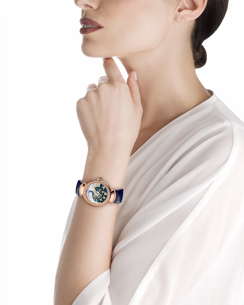 The DIVAS’ DREAM timepiece is inspired by the patterned Roman mosaics of the Baths of Diocletian, where the motif of the peacock reigns sovereign as the symbol of vanity and supreme beauty. Preening with sophistication, this creation reveals the precious colour combinations of the fanned tail of the regal animal and celebrates with a precious design the pure beauty of the iconic fan shaped motif. DIVAS' DREAM watch with manufacture mechanical movement, automatique winding, BVL 191 caliber, 37 mm 18 kt rose gold case set with brilliant-cut diamonds on the bezel, 18 kt rose gold crown set with a sapphire, 18 kt rose gold link set with brilliant-cut diamonds, mother-of-pearl dial with hand-painted peacock set with diamonds, dark blue leather strap and 18 kt rose gold folding clasp. Water resistant up to 30 metres.