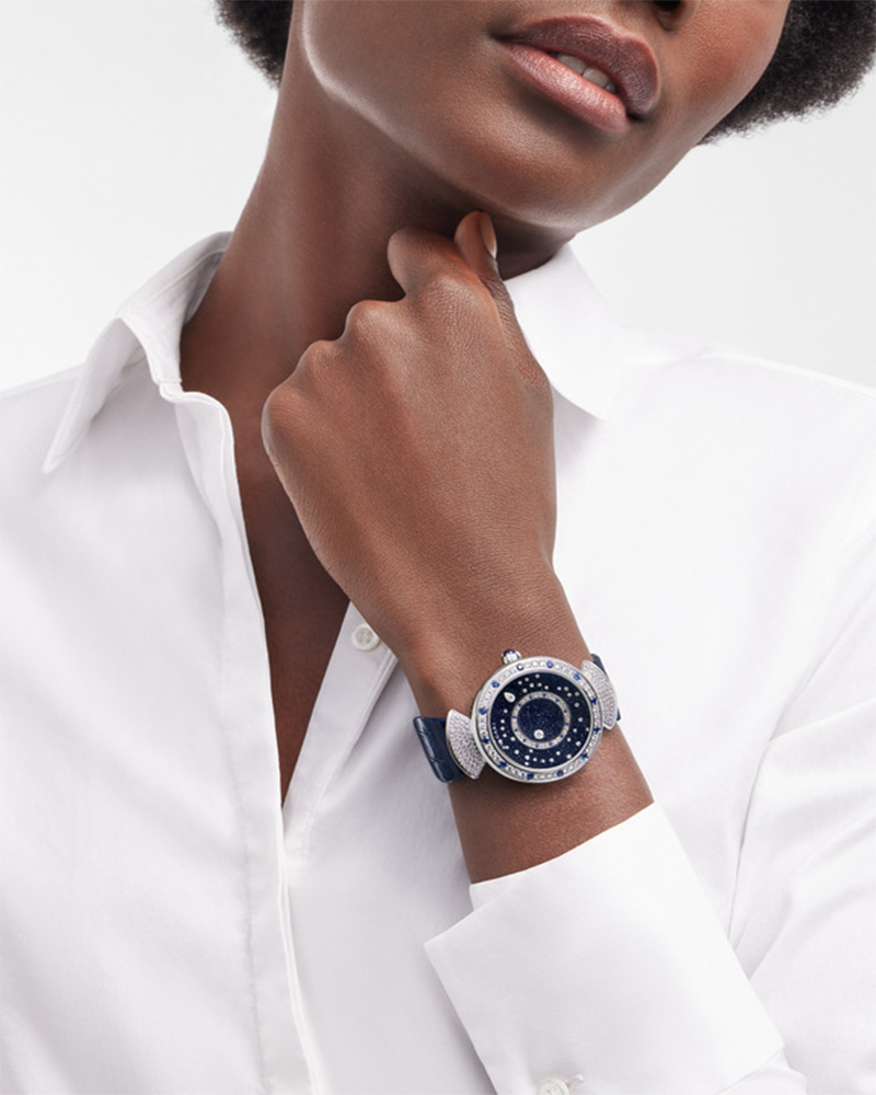 Inspired by the magic of a Roman night, the Divas’ Dream watch captures the poetry of the city’s star studded sky. With its blue aventurine dial building the backdrop to a diamond constellation, the watch’s design mirrors faithfully the sky map of the Eternal City. Through an exquisite mechanism based on the rotation of two discs, two floating diamonds mark the hours and the minutes as the brightest stars of the firmament. The case is embraced by the iconic fan-shaped motif of the collection, drawing its feminine design from the mosaic of Rome’s ancient Caracalla Baths. DIVAS' DREAM watch with mechanical manufacture movement, automatic winding, BVL 308 caliber, 37 mm 18 kt white gold case set with round brilliant-cut diamonds and sapphires, smoked sapphire glass backcase, 18 kt white gold crown set with a sapphire, aventurine rotating discs with diamonds and printed constellations, dark blue leather strap and 18 kt white gold pin buckle.
