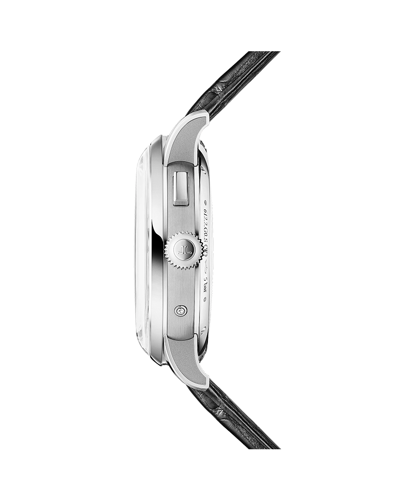 A pioneer in the Duometre collection, a platinum case is paired with a copper-coloured opaline dial. This daring, original combination remains highly prized by connoisseurs of fine watchmaking. Equipped with Calibre 391, featuring twin barrels and two gear trains, the Duometre Chronograph Moon reveals the full complexity of its functions through its finely decorated counters: chronograph and moon phase at 2 o'clock, hour-minute and day/night indicator at 9 o'clock, central seconds in blue sweeping the tachometric scale around the circumference of the dial, seconde foudroyante (emblematic of the collection) at 6 o'clock, power reserves.CASE Platinum 950/1000 Diameter: 42.5 mm, Thickness: 14.2mm, WATER RESISTANCE 5 bar, DIAL Appliqued numerals, Copper, Opaline, STRAP Black Leather Interchangeable: No Lug width: 21mm Length 12h: 75mm Length 6h: 120mm, BUCKLE Pin buckle Platinum 950/1000 Buckle width: 18mm JAEGER-LECOULTRE CALIBRE 391 FUNCTIONS Twin Power-Reserve, Chronograph's Second, Jumping seconds, Hour - Minute, Seconds, Moon phase, Day/Night indicator, Chronograph. MOVEMENT Manual winding, Components: 482, Vibrations per hour: 21600, Jewels: 54, Barrel: 2, Thickness: 8.24mm, Power reserve: 50 hours
