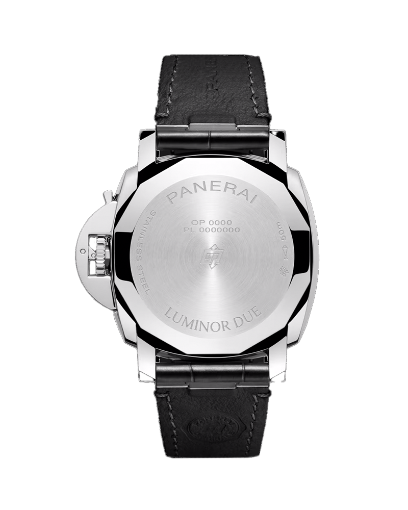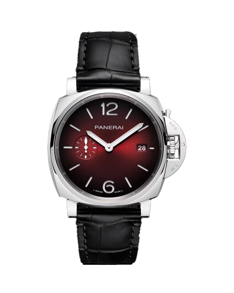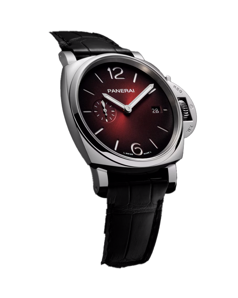 Movement Automatic mechanical, P.900 calibre, 12 ½ lignes, 4.2 mm thick, 23 jewels, 28,800 alternations/hour. Incabloc® anti-shock device. Power reserve 3 days, one barrel. 171 components.Functions Small seconds , Minutes , Calendar aperture , Hours. Case Diameter 42mm, polished steel, Bezel Polished steel, Dial Burgundy sun-brushed with luminous Arabic numerals and hour markers. Date at 3 o'clock and small seconds at 9 o'clock.Water Resistance "5.0 bar (~50.0 metres)". Strap and Buckle Strap: Black, STD, 22/18, BA, PAM Click Release System™ Buckle type: Polished steel folding clasp, 18mm, PAM Click Release System™