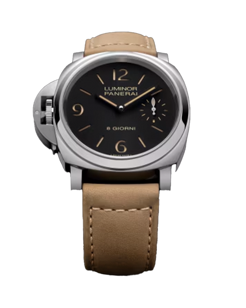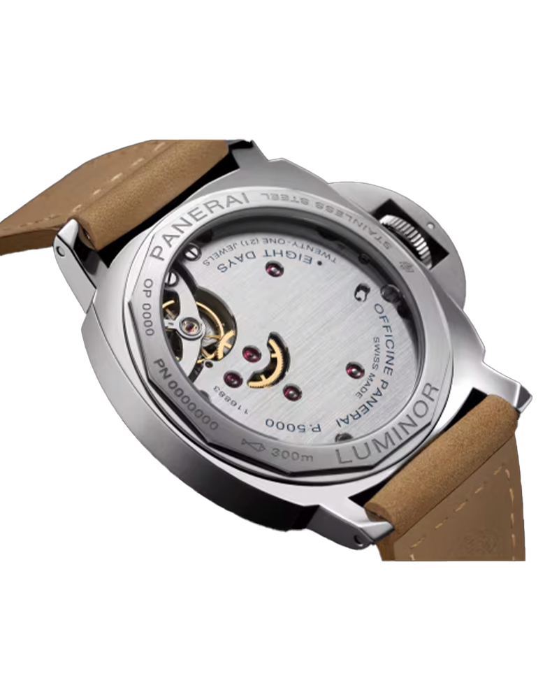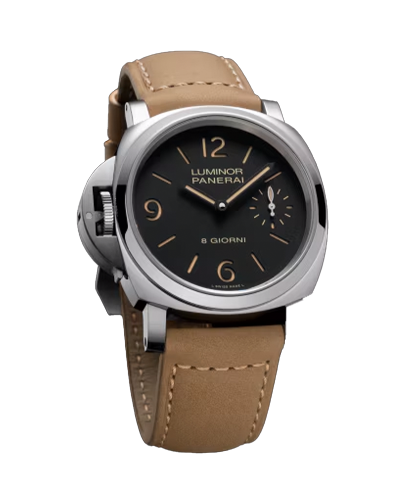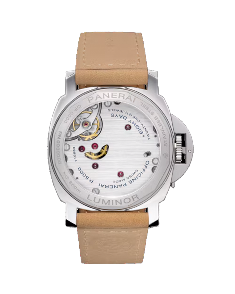 Hand-wound mechanical, P.5000 calibre, 15 ½ lignes, 4.5 mm thick, 21 jewels, Glucydur® balance, 21,600 alternations/hour. Incabloc Parechoc® anti-shock device. Power reserve 8 days, two barrels. 146 components, Hours , Small seconds , Minutes, Polished Steel, Black with luminous Arabic numerals and hour markers. Small seconds at 3 o'clock, 30.0 bar (~300.0 metres), Strap: Scamosciato light brown, beige, STD, 24/22, BA Buckle type: Trapezoidal brushed steel, 22mm
